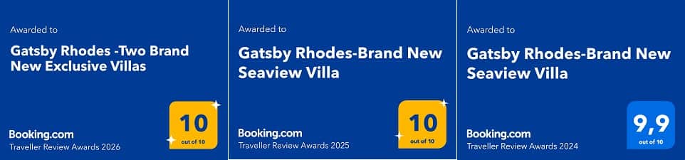 Gatsby- Rhodes, a brand new villa to kick back and relax. Conceived with attention to your comfort. Calm, stylish, spacious, surrounded by old oak, palm trees and natural vegetation. An astonishing view of the Aegean sea will take your breath away, you can reach the nearest beach in just two minutes by car. When in need for crowds, shops, coffee places, restaurants, bars and beach bars the modern city of Rhodes and the Old town are just five minutes away by car.